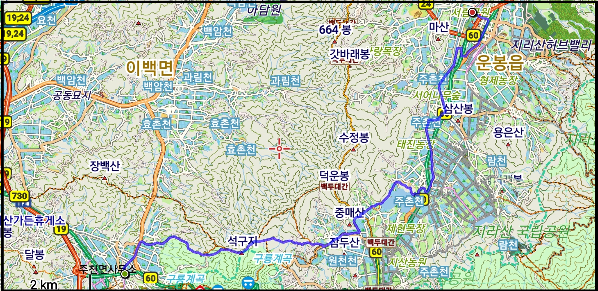 3. 산행코스 : 주천 장안교 - 내송제/은송저수지 - 인증센터 - 구룡치 - 덕치리(회덕마을 - 중미산아래 - 노치마을) - 덕산저수지 - 질미고개 - 가장마을 - 덕산마을입구 - 행정마을입구 - 가장교 - 행정교 - (운봉농협하나로마트) - 운봉초교정문 - 서림공원주차장