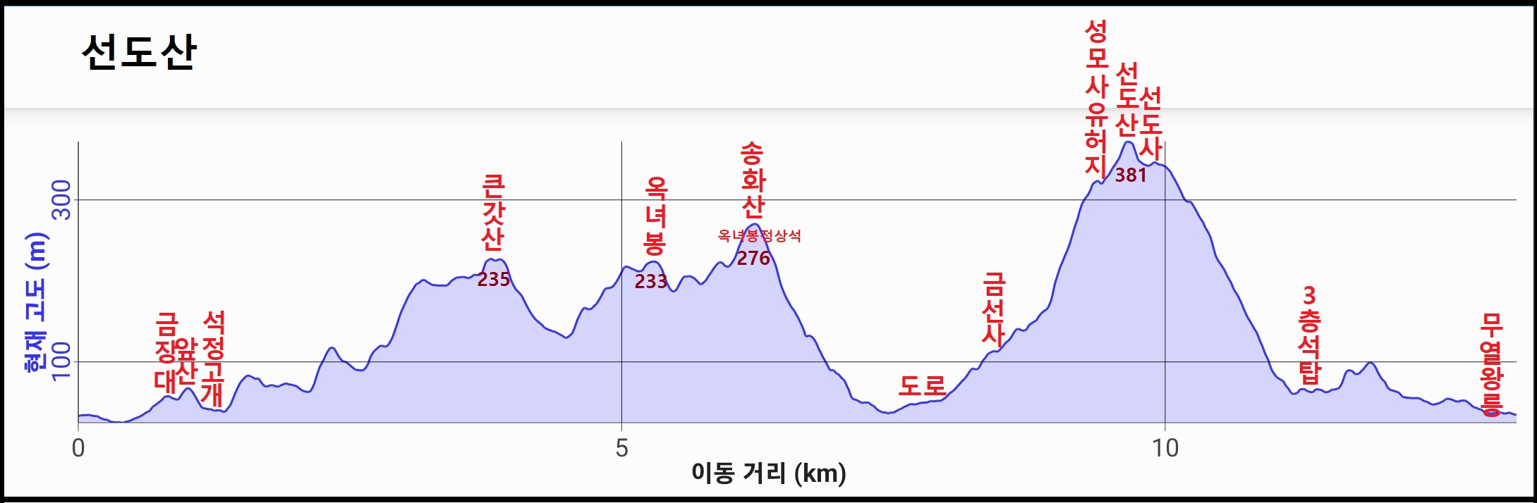 C. 산행코스 : 동국대병원앞 - 중앙선철도굴다리 - 석장동암각화 - 금장대 - 앞산 - (등산로불량_ 없음) - 석정고개 - 동국대부설유치원옆 /이정표 - (큰갓산: 청수산악회표지) - 큰갓산 - 옥녀봉 - 송화산(옥녀봉 정상석) - 대성공원 빌라 - 경주정보고등학교정류장 - 도로횡단 - SK에너지충효셀프주유소 - 금선사 - 신원사약수/시멘트도로이탈 - 성모사유허지 - 월성중학교갈림길 - 선도산 - 선도사/서악동 마애여래삼존입상 - 서악동바위구멍유적 - 서악동 삼층석탑 (후진) - (왕릉입구) - 오소년공적비 - 서악동 주상절리 - 용작골주상절리 - (길없음) - 진흥왕릉 등 - 왕릉입구 - 도봉서당 - 새골못/보희연못 - (월장) - 서악리고분군- 무열왕릉 - 무열왕릉주차장/김인문묘옆