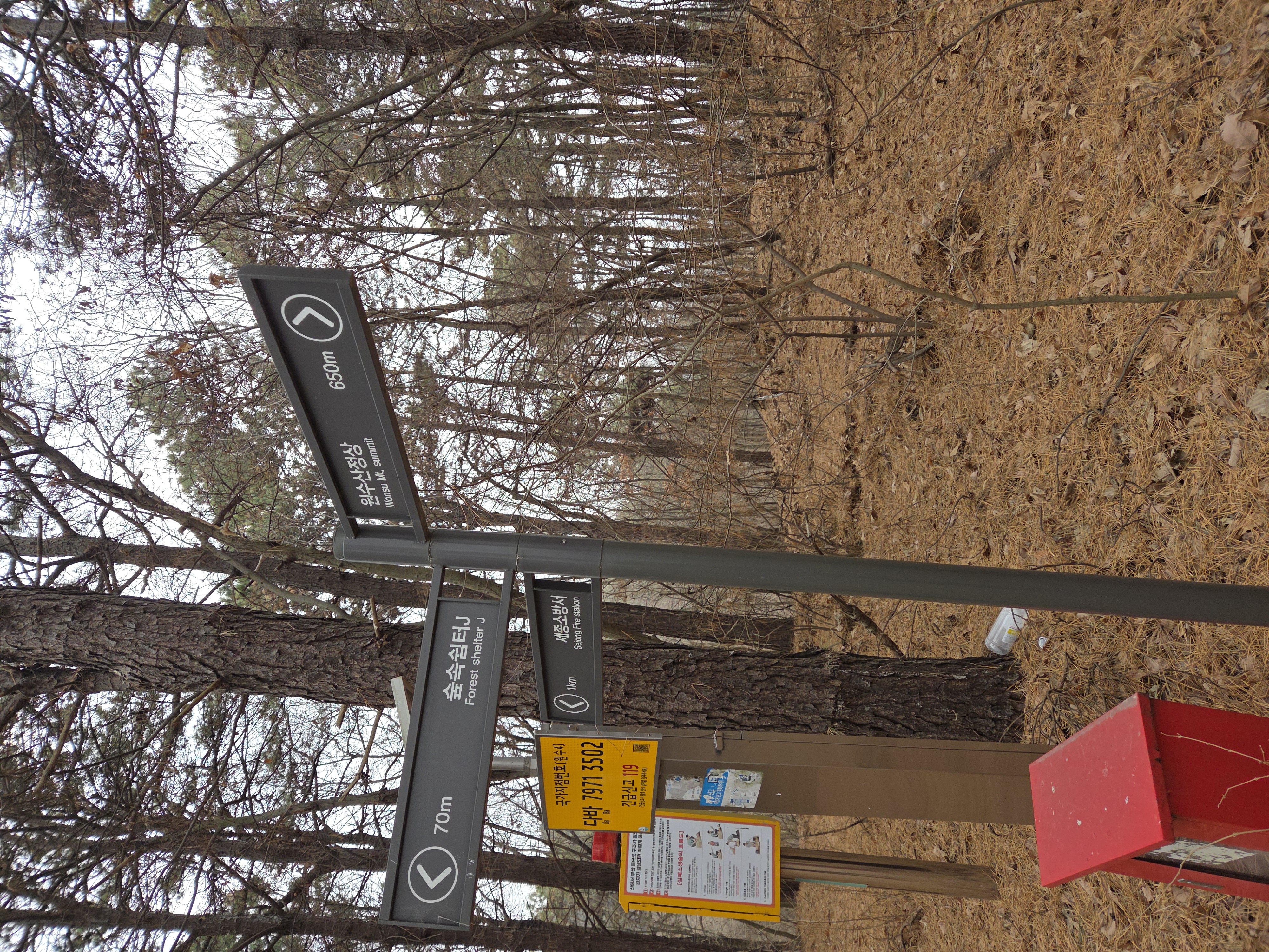 8. 진행 6.9km 지점에서 잘 나있는 우측 등로를 택하지 않고 능선길로 진행하여 세종서방서로 내려서다. 이후 도로를 1.7km를 걸어 광제사로 진행하다.